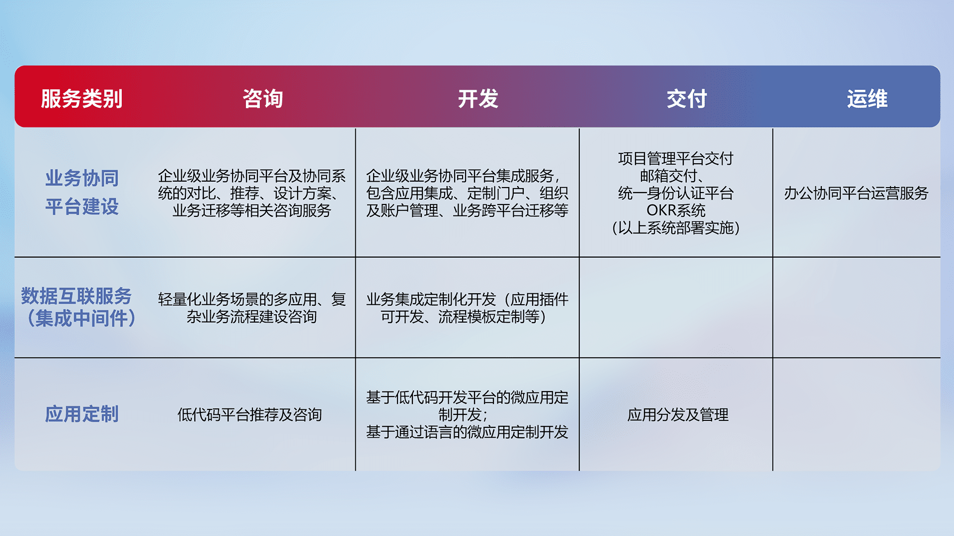 针对钉钉、、企微、、、、IDaas等平台级产品提供产品的规划、、、方案、、、交付、、定制化开发等服务,,,,实现如统一协同办公、、、、智能客户服务、、、、混合会议管理、、智能数据查询、、等业务场景,,,实现数字化转型。。。